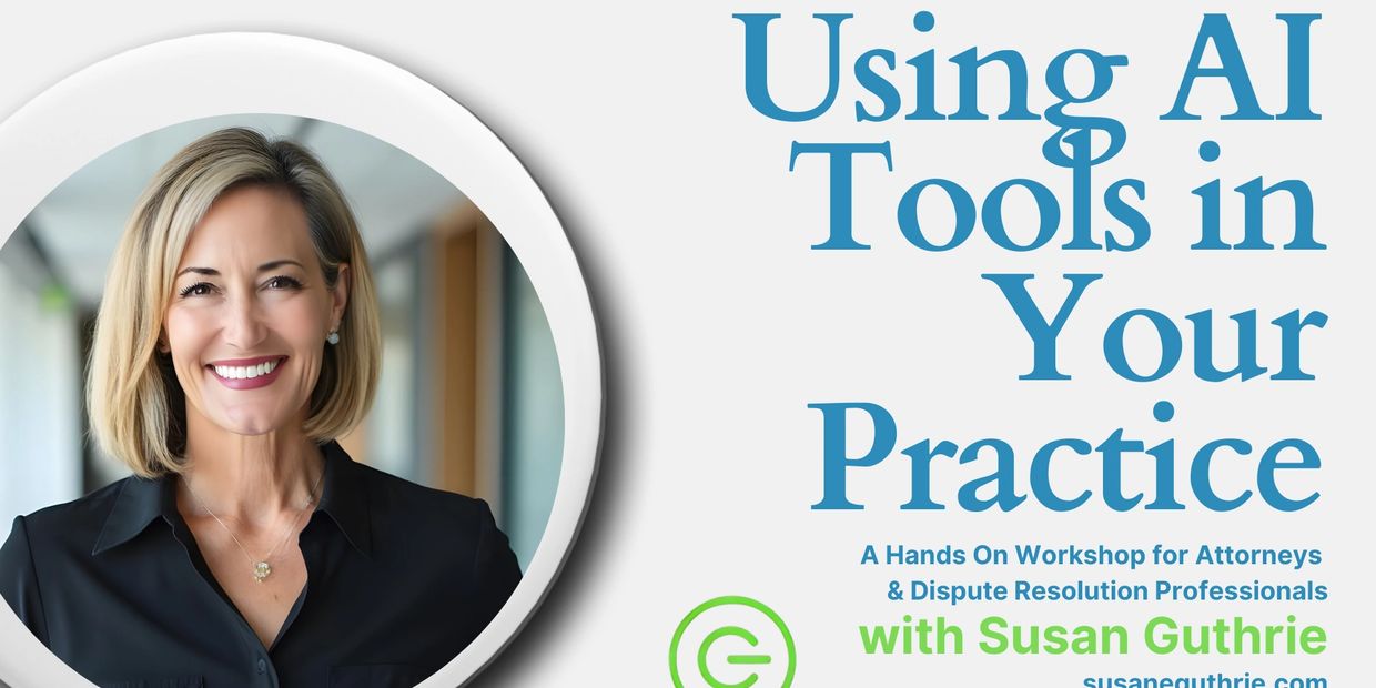 Join Susan Guthrie for a hands-on AI workshop designed to give you practical skills you can use immediately. Learn what’s working (and what’s not) with tools like ChatGPT, Gemini, and Claude — and explore real-world applications from marketing to mediation-room strategies.
